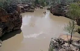 The Yapunyah Waterhole is a permanent waterhole in the Cooper Creek catchment and the Lake Eyre Basin. It lies in the Grey Range[3] between Adavale and Yaraka in South West Queensland.[4] The waterhole is fed by Nutting Creek, which starts at an elevation of 347 metres and drops around 85.5 metres over its 72 kilometre length before merging with Powell Creek.[5] Powell Creek in turn flows through Hell Hole Gorge National Park to the south-west and eventually into the Barcoo River. The waterhole is surrounded by mulga Acacia aneura woodland. Rainfall averages 390 millimetres per year and is exceeded by evaporation of three to four metres per year.