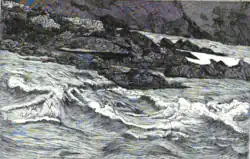 The explorer Henry Morton Stanley, who visited the falls on April 6, 1880, wrote that over a five or six mile stretch the incline was only 45 feet (14 m), but that the "general fury of the water is caused by the obstructions which the giant volume meets in the bed of the narrow defile."[15] Sir Harry Johnston, who visited the falls in 1883, called the river "the last grand fall of Yellala" and detailed the sight and sounds of his impression of the falls.[16]
