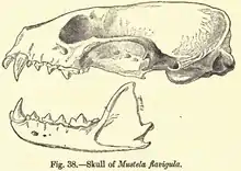 The yellow-throated marten is a large, robust, muscular and flexible species with an elongated thorax, a small pointed head, a long neck and a very long tail which is about 2/3 as long as its body. The tail is not as bushy as that of other martens, and thus seems longer than it actually is. The limbs are relatively short and strong, with broad feet.[2] The ears are large and broad, but short with rounded tips. The soles of the feet are covered with coarse, flexible hairs, though the digital and foot pads are naked and the paws are weakly furred.[3] The skull is similar to that of the beech marten, but is much larger. The baculum is S-shaped, with four blunt processes occurring on the tip. It is larger than other Old World martens; males measure 500–719 mm (19.7–28.3 in) in body length, while females measure 500–620 mm (20–24 in). Males weigh 2.5–5.7 kg (5.5–12.6 lb), while females weigh 1.6–3.8 kg (3.5–8.4 lb).[4] The anal glands sport two unusual protuberances, which can be used to secrete a strong smelling liquid for defensive purposes.[5]