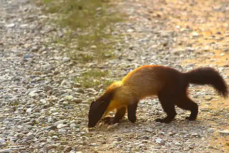 The yellow-throated marten (Martes flavigula) is a marten species native to the Himalayas, Southeast and East Asia. Its coat is bright yellow-golden, and its head and back are distinctly darker, blending together black, white, golden-yellow and brown. It is the largest marten in the Old World, with its tail making up more than half its body length.
