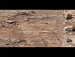 It was from the Sheepbed layer that Curiosity took two drilling samples from the mudstone sedimentary rock. These drill samples were named John Klein and Cumberland and were, respectively, the second and third drilling samples Curiosity retrieved from the martian regolith.[1] The first being an eolian deposit, named Rocknest, sampled from an area 60 m (200 ft) to the west of Yellowknife Bay. The two samples were drilled 3 m (9.8 ft) apart and within 10 cm (3.9 in) of the same stratigraphic level.