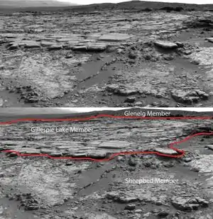 Active erosion, attributed to both aeolian and fluvial events, has caused the Gillespie Lake Member to weather away, revealing the underlying Sheepbed layer and creating a topographic step observable in HiRISE images from the Mars Reconnaissance Orbiter. The Gillespie Lake bed appears massive and is composed of poorly sorted, angular to well-rounded grains, which make up sheetlike sandstone basalt. These characteristics further support a model of fluvial transport and deposition. In addition, sandstone beds associated with the Gillespie Lake Member seem similar to microbially induced sedimentary structures (MISS) found on Earth, according to one study.[13]