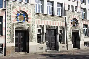 The Yenidze Tobacco and Cigarette Factory (German: Orientalische Tabak- und Zigarettenfabrik Yenidze) was a tobacco company started by the Jewish entrepreneur Hugo Zietz, which imported tobacco from Ottoman Yenidze, Thrace (modern Genisea, Greece). The "Oriental" style of architecture recalled the exotic origins of the Oriental tobaccos it processed and functioned as advertising for the firm.[1][2] It has 600 windows of various styles; the dome is 20 metres (65') high. It makes great use of tiles for decoration: both complex colour patterns and unusual three-dimensional forms.