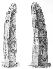 Re-used Deer stone stele (circa 1000 BCE), with Uyuk Turan Inscription.[9]