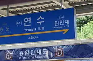 Yeonsu Station is a subway station on the Korail-operated Suin–Bundang Line in Yeonsu-gu, Incheon, which opened on June 30, 2012.