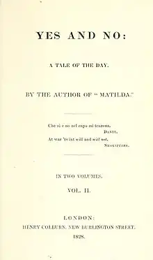 Yes and No is an 1828 novel by the British writer and politician Lord Normanby, originally published in two volumes. It was part of the popular genre of silver fork novels which focused on the British upper classes in the later Regency era. It was his second published work following Matilda in 1825. The novel focuses heavily on the politics of Britain in the late 1820s, focusing on three main protagonists and examining the Whigs, liberal Tories, and Ultra-Tories.[1]