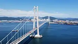 Yi Sun-sin Bridge (Korean: 이순신대교; Hanja: 李舜臣大橋) is a suspension bridge in Yeosu, South Jeolla Province, South Korea. The bridge is one part of The Approach Road to Yeosu Industrial Complex. It is the world's eighth longest suspension bridge in terms of its main span length of 1,545 m since it opened in 2012.[1] The bridge connects Gwangyang with Myodo-dong, a small island that is also part of Yeosu.