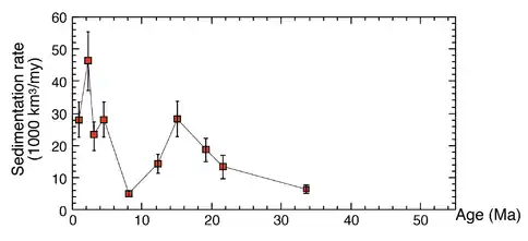 The sediments filled in the Yinggehai Basin came mostly from Tibet plateau and was transported mostly by the Red River, and the depocenter has migrated southward since the Oligocene. The peaks in sediment was during the Miocene and the Plio-Pleistocene (Figure 4).[1]