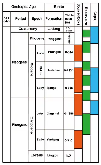 Late Miocene (Huangliu formation): shale, shaly sandstone, and sandstone from littoral to bathyal basin floor fan environment. The thickness is around 0–664.
