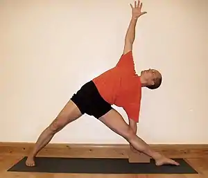 The yoga teacher and author Candace Moore writes that yoga bricks can be useful for both beginners and advanced practitioners. Beginners can benefit from supporting their hand in asanas such as Trikonasana, Triangle pose, sitting on a block in a forward bend such as Paschimottanasana, or supporting one buttock in Eka Pāda Rājakapotāsana (King Pigeon pose), giving a beneficial forward tilt to the pelvis.[7][9] Moore suggests that a pair of blocks can be used to support the knees in the seated Baddha Konasana, Cobbler's pose,[7] while practitioners can work towards more advanced poses using a block under each hand to practice arm balances such as Eka Hasta Bhujasana (Elephant's Trunk pose), a preparatory asana for Astavakrasana.[7] Similarly, in Iyengar Yoga, a pair of yoga bricks can be used under the feet in Urdhva Dhanurasana (Upwards Bow pose) to enable the lower trunk to lift better, or the hands can be placed on yoga bricks.[10]