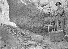 One of the Englishmen who came to the area was Charles Gadsden of Berkhamsted, Hertfordshire. By 1902, Gadsden was promoted to resident supervisor of the English Mine, and he quickly turned its focus from gold to sapphires.[53] Gadsden's security measures were very tight, as weight-for-weight, rough sapphires were and continue to be worth much more than gold.[65] The English Mine flourished until the 1920s,[61][63] but floods on July 26, 1923, so severely damaged the mines that they never fully recovered.[66] Between the aftermath of flooding and hard economic times, the English Mine finally failed in 1929.[66] It had recovered more than 16 million carats (3.2 t) of rough sapphires that produced 2.5 million carats (500 kg) of finished gems valued at $25 million in 1929 dollars (approximately $430 million as of 2024).[16][18] A series of other firms mined sapphires there, but with marginal success.[44][61][63] For much of the 1930s and 1940s Gadsden worked the mine alone and used his own money to pay its property taxes.[67] He remained caretaker of the mines until shortly before his death on March 11, 1954.[68]