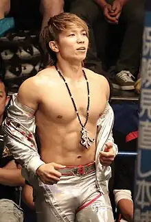 He made his debut for NJPW on November 19, 2012, on NJPW's NEVER project's Shodai NEVER Musabetsu Kyu Oza Kettei Tournament show where he lost to Takaaki Watanabe.[7] Komatsu competed as one of NJPW's "Young Lions", a class of rookie wrestlers who work mostly against each other early on, wearing all black gear and with no particular ring character, all part of the structured learning process in NJPW.[6] In 2013, he competed in his first major NJPW tournament, teaming up with Kushida to compete in the 2013 Super Junior Tag Tournament. The team lost in the first round to Bushi and Valiente.[8] [9] On January 4, 2014 Komatsu teamed up with Jyushin Thunder Liger, Manabu Nakanishi and Super Strong Machine to work a non-televised match at Wrestle Kingdom 8, NJPW's biggest show of the year. The team lost to Bushi, Captain New Japan, Hiroyoshi Tenzan and Tomoaki Honma.[10][11] Throughout 2013 and 2014, Komatsu often faced off against fellow Young Lion Sho Tanaka, with both men trading victories in both singles and tag team competition.[12] By 2015, Komatsu and Tanaka had begun teaming together on a regular basis, including working together in the New Japan Rumble as part of Wrestle Kingdom 9 on January 5, 2015. The two teamed up to eliminate Tiger Mask and Taichi but were both eliminated by Tama Tonga.[13] On January 15, 2015, Komatsu competed at the Fantastica Mania 2015 event as he was called upon to replace the injured Rey Cometa in the NJPW/Consejo Mundial de Lucha Libre (CMLL) co-promoted event. The team of Komatsu and Kushida lost to Bárbaro Cavernario and Yoshi-Hashi.[14] On February 11 at The New Beginning in Osaka, Komatsu lost to Tanaka and three days later Komatsu and Satoshi Kojima lost to Captain New Japan and Nakanishi.[15][16] The Invasion Attack 2015 show saw Komatsu, Alex Shelley, Captain New Japan, Kushida and Yuji Nagata defeated Liger, Nakanishi, Ryusuke Taguchi, Sho Tanaka and Tiger Mask.[17]