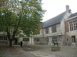 The abbey occupied an extensive precinct site immediately outside the city walls, between Bootham and the River Ouse.[3][7] The original boundary included a ditch and a narrow strip of ground, but the walled circuit was constructed above this in the 1260s in the Abbacy of Simon de Warwick;[7] the walls were nearly three-quarters of a mile long. In 1318 the abbot received royal permission to raise the height of the wall and crenellate it; a stretch of this wall still runs along Bootham and Marygate to the River Ouse.[2]