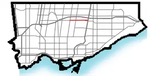 In the 1970s, when the Toronto Transit Commission extended the Line 1 Yonge subway line north from the Eglinton terminus, a new roadway alignment from York Mills to Wilson was completed in 1973 to accommodate 96 Wilson Avenue buses running directly to the new York Mills subway station rather than travelling south on Yonge Boulevard to Yonge Street terminus at Glen Echo Loop.[2] Landmarks along York Mills Road include a recreation complex at Bayview Avenue, York Mills Collegiate Institute, a large Rogers Communications complex past Leslie Street, and the former site of the Upjohn Company of Canada near Don Mills Road at Upjohn Road.