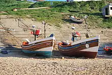 Some of the first experiments in deep-sea trawling were conducted off the Holderness Coast at Flamborough in the early part of the 19th century.[12] However, until the days of large fishing trawlers in the 20th century, the most common boat in service across Yorkshire (and the north east coast) was the Coble. The design of the coble is a basic one with a short plank laid horizontally instead of a keel and a flat bottom on the boat. The flat bottom allowed the coble to be berthed almost anywhere as it did not need extensive harbour facilities; most cobles where simply hauled onto the beaches when not in use.[13]