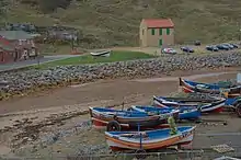 The coble (pronounced cobble) has been on the eastern coast of Britain for a 1,000 years[14] and has a ribbed look (known as clinker built) where the planks, made from larch wood, overlap each other.[15][16] The coble fell out of favour after the First World War as they were sail boats, and motorised fishing vessels took their place,[17] although some cobles have had engines fitted.[18] There are now several preservation movements dedicated to the history of the coble.[19][20]
