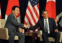 Noda told his foreign policy and was said to have close relations with the United States, and stressed the importance of the US-Japan security alliance in August 2011 speech.[13] On 15 August 2011 —the anniversary of the Surrender of Japan in World War II, he said that Japan's class A war criminals convicted by the Allies were not legally war criminals under his view.[14] As prime minister of Japan, he stated that his position on this issue would follow the standard set by previous administrations, and that he did not wish to alter close relationship with China and South Korea.[15]
