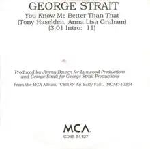 "You Know Me Better Than That" is a song written by Anna Lisa Graham and Tony Haselden, and recorded by American country music artist George Strait. It was released in June 1991 as the second single from his album Chill of an Early Fall. It peaked at number 1 on both the U.S. Billboard Hot Country Singles & Tracks chart and the Canadian RPM Country Tracks chart.[1]
