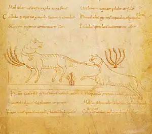 The Ysengrimus draws on earlier traditions of beast fable in Latin, such as the 11th-century Ecbasis captivi.[3] In the Ecbasis, the now traditional opposition of wolf and fox appears. The Ysengrimus is the most extensive anthropomorphic beast fable extant in Latin, and it marks the first appearance in Latin literature of the traditional names "Reinardus" and "Ysengrimus". The poem runs to 6,574 lines of elegiac couplets.[4] The Ysengrimus is divided into seven books, which contain twelve or fourteen tales; opinions differ on how to divide them. Other beast fables were written by other medieval Latin authors, including Odo of Cheriton; the Ysengrimus is the most extensive collection of this material either in Latin or in any vernacular.