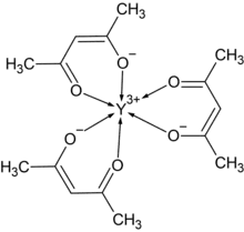 Yttrium acetylacetonate is a coordination compound of yttrium, with the chemical formula of Y(C5H7O2)3, or Y(acac)3 for short. Its instability constants (logYn) are 2.08, 3.81 and 4.98 (n=1, 2, 3).[2] It can be prepared by the reaction of trialkoxyyttrium[3] or tris[bis(trimethylsilyl) amino]yttrium[4] and acetylacetone. It thermally decomposes to form yttrium oxide.[5]