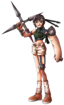Yuffie appears in the 1997 role-playing video game Final Fantasy VII as one of two optional party members along with Vincent. She is a 16-year-old ninja and thief who wields shurikens that she can throw like a boomerang. She is a fiercely patriotic daughter of Godo Kisaragi (ゴドー・キサラギ, Godō Kisaragi), the leader of Wutai (ウータイ, Ūtai), which is based on East Asia; Yuffie feels her country has lost its former glory and become nothing more than a resort town.[19] After losing the war against Shinra Electric Power Company, Godo began to turn Wutai into a tourist attraction. This did not suit Yuffie, who began running off, stealing Materia from travelers in hopes of someday becoming strong enough to change this situation.[20] Yuffie is sneaky and arrogant[21] and has a tomboyish and charismatic[22] personality and obsessively steals and collects Materia.[23] She also tends to be short-tempered and is prone to motion sickness.[23] Gameplay-wise, Yuffie possesses the special Materia "Throw", enabling her to throw most items from the player's inventory at enemies during combat. When leveled up, she unlocks the ability "Coin", allowing her to throw the party's Gil currency at the enemy.[1]