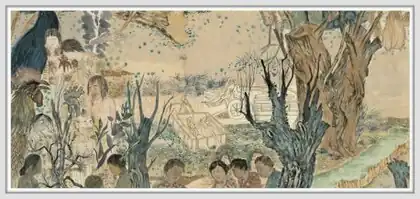 In exhibitions at James Cohan Gallery ("Water That Floats the Boat Can Also Sink It," 2007; "Mistaking Each Other for Ghosts," 2010), Ji's epic, cautionary scrolls delved further into the project, portraying migration in physical and psychic terms that emphasized loss and a literal haunting of those supplanted by melancholic wraiths and scraggly scavengers (e.g., Last Days Before the Flood, 2006).[31][6][35] In the latter show, Ji was inspired by the ghost stories of the 18th-century Chinese writer Pu Songling and the French writer, Marquis de Sade, in several works linking Sade's decadent noblemen to contemporary Chinese political leaders.[44][19] The show included the ten-foot-wide horizontal scroll, Migrants of the Three Gorges Dam (2009), which was hand-printed from 500 carved woodblocks. It portrayed dispossessed farmers and flooded landscapes alongside calligraphic reports and descriptions of the flooding of the Yangtze River based on Ji's own research, interviews and observations.[19]