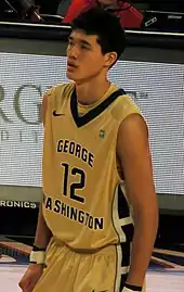In fall of 2014, George Washington Colonials head coach Mike Lonergan received a phone call from Jamie Cosgrove, a coach at Trinity College who saw Watanabe play with St. Thomas More.[6] Watanabe eventually committed to play for George Washington. This move allowed him to attend George Washington University for the 2014 year as a freshman.[8] It was made official when Watanabe posted the message through Twitter, "I've decided to go to George Washington University. The school has a good basketball team, too. I'm sure I'll have hard times both in basketball and academics, but I'll give it my best shot."[9] According to ESPN, his second option was Fordham, who gave Watanabe an offer to join their team as well.[9] He became the first-ever Japanese-born man to be given an NCAA Division I basketball scholarship,[10][11] and was only the fourth to ever play college basketball at that level.[lower-alpha 1][12] Regarding Watanabe's collegiate career, former Japanese college basketball player, KJ Matsui, said, "It's good for Nabe-chan (Watanabe) to play at a competitive team, but he's going to have to battle for playing time."[13] The Colonials had four other recruits coming into the program for 2014–15: Anthony Swan, Darian Bryant, Matt Cimino, and Paul Jorgensen.[14]