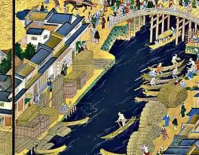 The earliest za came into being in the 11th century, consisting not only of trade guilds, but also guilds of performers and entertainers. A woodcutters' za is mentioned in Yase near Kyoto as early as 1092, having a firewood concession in Kyoto along with corvée obligations.[1] Even today, performers of kabuki and noh are in associations called za (see Kabuki-za). The za trade guilds appeared as a major force in the 14th century, and lasted in their original forms through the end of the 16th, when other guilds and trade organizations arose and subsumed the za. While no longer powerful in their original forms, it could be argued that the basic concept of the za, and most likely the same merchants running them, continued to exist as powerful agents in the market through to the 18th, going through many organizational and structural changes over the centuries, and eventually being eclipsed by other organizations like the ie trading houses. Though very powerful at times, and enjoying certain tax exemptions and other formal governmental benefits, it is important to note that the za, at least in their original forms, were never as official or organized as the medieval guilds of Europe.