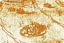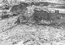 The outer bailey was investigated in 1987. It measured approximately 75 by 50 meters, with a surrounding moat of 15 to 25 meters wide. The moat on the site of the village was investigated most thoroughly. Here the wood dated to having been cut between 1089 and 1103 (as earliest possible date) had been used as a pile for a bridge.[7][9] Marks on the wood showed that it was first used for a different purpose. It may be assumed that it came from a construction on the motte.[8]