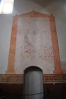On the opposite side is the former Franciscan monastery founded in 1567, which was the center of evangelization efforts for the area.[8] It is the oldest such construction in the state of Puebla and the church is the only one in Latin America which has been in continuous use since its founding.[5] In the courtyard of the monastery, there is a fountain called the Fuente de las Sirenas (Fountain of the Mermaids).[9] After years of abandonment, the complex underwent extensive restoration in the 2000s. This work discovered colonial era murals on the interior walls.[10] This mural work contains images of deer, bees and jaguars, houses with thatched roofs and daily scenes with Spanish and indigenous people.[5]