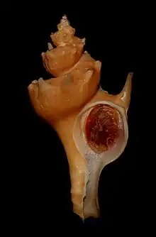 Shell and operculum of Zacatrophon beebei (Hertlein & Strong, 1948), from off Cabo San Lucas, Mexico, in bait traps at 100 m