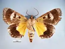 Adults are brown and yellow, with a unique colour pattern on the underside of the forewing.