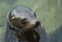 Slightly smaller than their Californian relatives, Galápagos sea lions range from 1.5 to 2.5 m (4.9 to 8.2 ft) in length and weigh between 50 and 400 kg (110 and 880 lb), with the males averaging larger than females.[1][2][3] Adult males also tend to have a thicker, more robust neck, chest, and shoulders in comparison to their slender abdomen. Females, by contrast, have a longer, more slender neck and thick torso. The male's sagittal crest enlarges when he reaches sexual maturity, forming a small, characteristic bump-like projection on his forehead. Adult females and juveniles lack this trait and have a nearly flat head and little or no forehead. Galápagos sea lions, compared to California sea lions, have a slightly smaller sagittal crest and a shorter muzzle.[4]