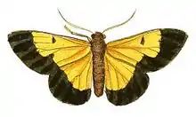 Upperside: Antennae setaceous. Thorax and abdomen brown. Anterior wings greyish yellow, with a single spot placed near the middle, almost close to the anterior edge. Posterior wings of the same colour as the anterior, and like them surrounded with a deep black border.