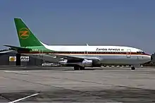 February 1970 saw the upgauge of frequencies to London, with a second flight operated along the Lusaka–Nairobi–London run. Two HS-748s and a Douglas DC-8-43 from Alitalia were added to the fleet. The HS-748 came to replace four DC-3s the company had deployed on domestic routes.[4] A charter subsidiary named National Air Charter Zambia (NACZ) was formed in 1974; operations began in March the same year using a leased Canadair CL-44.[6] Also in 1974, the first Boeing 707-320C joined the fleet.[7] Two more Boeing 707s were purchased from Aer Lingus and Pan Am in early 1975.[8] Another Boeing 707-320C was acquired from the Aer Lingus on 24 March 1975. By this time, the contract with Alitalia was cancelled and a similar one was signed with Aer Lingus.[7] The introduction of the Boeing 707 enabled the airline to launch direct services from Lusaka to London and Frankfurt in April 1975 and July 1976, respectively. By late 1976, the DC-8s were replaced with Boeing 707s.[7] In early 1975, the two BAC One-Eleven 200s were sold to Dan-Air.[9] Prior to ordering a Boeing 737-200 Advanced directly from the aircraft manufacturer in June 1975, a Boeing 737 had been wet-leased from Aer Lingus.[7] The ordered 737 was intended as a replacement for the wet-leased aircraft;[10] it entered service in late June 1976.[5] On 14 May 1977, a Boeing 707 was involved in an accident with fatalities near Lusaka.[7]