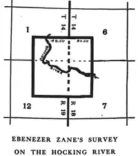 The town of Lancaster, Ohio was laid out in 1800,[2] or 1799,[1] at the site of the Hocking river ferry, by Ebenezer's sons, John and Noah Zane. These two had power of attorney to sell lots for Ebenezer Zane, and he never visited Lancaster.[1] The tract lies in T14 R18 and T14 R19 of the Congress Lands East of Scioto River. 39°42′30″N 82°36′14″W / 39.70833°N 82.60389°W