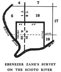 Ebenezer Zane chose a site across from Chillicothe, Ohio, and about a half mile north of the town.[2] The survey lies in T8 R21 and T1 R22 of the Congress Lands East of Scioto River 39°20′53″N 82°58′14″W / 39.34806°N 82.97056°W