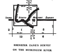 The tract Zane chose for a ferry on the Muskingum River was at the confluence with the Licking river, where he laid out the town of Zanesville, Ohio in 1799.[2] The survey was directed by Rufus Putnam in 1797.[1] Zane gave this tract to his brother Jonathan, and son-in-law McIntire, with the deed finally signed in December 1800, for their services in laying out the road. They, in turn, leased it to William McCullough, (a relative), and Henry Crooks for five years, provided they operated the ferry. McCullough and Crooks became the first residents of Zanesville in fall 1797.[1] The tract lies partially in what would be the United States Military District, in township 1 range 7 (T1 R7), and T1 R8 and partially in the Congress Lands East of Scioto River in T12 R13 and T16 R14. 39°56′26″N 82°00′51″W / 39.94056°N 82.01417°W[4]