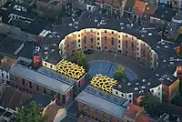 The building never had an official name, but it was popularly called "The Circle" (De Cirk) because of its circular central square. A 4th story was added in the 1930s. By the 1990s, the Ghent Workers Housing Company had evolved into the Ghent Housing Association (Gentse Huisvestingsmaatschappij), but they had trouble maintaining the decaying building. In 2001, the barely inhabited ruins were put up for sale and sold to the Liedts-Meesen Foundation. Between 2002 and 2005, this new owner reconstructed the exterior of the buildings into its original state and design, while profoundly reshaping the interior. It was the beginning of "The Zebrastraat project".[2] The goal of the new Zebrastraat project is to create an urban climate by combining and mixing art, business, and housing. People can rent short or long term apartments, companies can book meetings or events, and artists can display their performances.