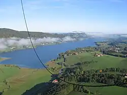 ![]() The Zeller Ache (bottom left) flowing out of lake Irrsee | |