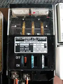 Zellweger is the brand name of an electric switching device also known as a Ripple Control Receiver used to control off-peak electrical loads such as water heaters by switching these loads OFF over peak energy use times of the day and switching them ON after peak energy use times of the day, hence the term 'off peak' control. It is an example of carrier current signaling. The Ripple Control Signal is generated at substations owned by Electricity Supply Authorities (as distinct from Electricity Generating Authorities) connected to the High Voltage transmission grid and injected into the Medium Voltage transmission grid at 11kV, 22kV, 33kV and 66kV, through a Coupling Cell consisting of a tuned L-C circuit (Tuning Coil - Capacitor). The Coupling Cell enables the Ripple Control Frequency to be superimposed on the 50 Hertz (Hz) mains frequency, which promulgates into the 415 V 3 phase power distribution lines providing energy to industrial and domestic customers of the Electricity Supply Authority. To avoid problems with other equipment connected to the distribution system (); i.e. industrial machinery and domestic appliances, the ripple frequency is selected to be offset from the third harmonic and its multiples, typically starting at 167 Hz and including, 217, 317, 425, 750, 1050, 1650. The choice of frequency depends upon the density of the load into which the ripple frequency is to be injected and the length of the distribution