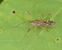 Zelus tetracanthus, the four-spurred assassin bug, is a species of assassin bug in the family Reduviidae. It is found in the Caribbean Sea, Central America, North America, and South America.[1][2][3] Adults are brown, black, or gray and have a body length of 10-16 mm. Their antennae and legs are long and slender. They have a row of four spurs across their thorax. Both adults and nymphs use a sticky secretion to capture prey.[4]