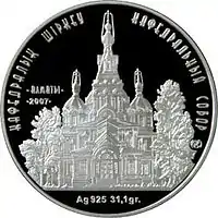 On June 2, 2007, the National Bank of Kazakhstan put into circulation the coin "Cathedral Cathedral" (proof quality) of 500 tenge in 925 sterling silver with the mintage of 4000 pieces with the aim to promote the understanding of the culture of Kazakhstan, and to favor the idea of religion as a peaceful teaching about spiritual and moral self-improvement of person. The coin bears the coat of arms of Kazakhstan as well as inscriptions divided by dots on its circumference saying "500 ТЕҢГЕ", "ҚАЗАҚСТАН РЕСПУБЛИКАСЫ" in Kazakh and "РЕСПУБЛИКА КАЗАХСТАН" in Russian are depicted on the obverse. Reverse: in the center - image of Voznesensky Cathedral of Alma-Ata city, in the upper part - circumferential inscriptions "КАФЕДРАЛЫҚ ШІРКЕУ" and "КАФЕДРАЛЬНЫЙ СОБОР" and trademark of Kazakhstan Mint, on the left side - inscription "ALMATY 2007", on the bottom - inscription "Ag 925 31.1g".[6]