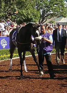 Zenyatta is a dark bay mare who was bred in Kentucky by Eric Kronfeld's Maverick Production, Limited.[1][7] She was sired by Street Cry, who was the 2002 UAE Horse of the Year after winning that year's Dubai World Cup. In addition to Zenyatta, Street Cry also sired 2007 Kentucky Derby-winner Street Sense, Australian Horse of the Year Winx, Australian champion Whobegotyou, and 2009 Melbourne Cup winner Shocking.[8] Zenyatta is out of Vertigineux, and thus is a half-sister to multiple Grade I winner Balance. Vertigineux, a winning daughter of Kris S., was named the 2008 Kentucky Broodmare of the Year.[9]