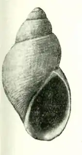 The aperture is narrowly ovate, angled above, its left contour slightly concave throughout (parietal wall not convex). The thin peristome is continuous The outer lip is sinuous below the suture, produced below the middle, the under lip somewhat retreating, and slightly bent down, forming a shallow and broad sinus. The columella is oblique, slightly curved, straight in the middle. The columellar lip is rather broadly reflected limiting an umbilical fissure and continuous on the parietal wall in a thin but distinct callus.[2]