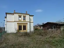 In 1990/91, the building was extensively renovated with a large amount of yellow used around the windows. It was given heritage protection in 1993.[2] Afterwards it continued to be used for residential purposes in the 1990s, but it stands empty today. Next to the station building there is a toilet block. South of the tracks is the goods shed, which was probably built in the 1880s.[2] The ensemble is itemised as the "station building with toilet block and forecourt" on the list of historic monuments.[7]