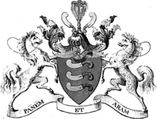 Coat of arms escutcheon depicts three leftwards facing, horizontally aligned silver knives with golden handles