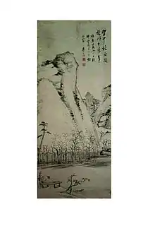 Zha Shibiao or Cha Shih-piao (Chinese: 查士标; 1615–1698) was a Chinese calligrapher and landscape painter from Anhui. He was affiliated with the Anhui School, also known as the Xin'an School, which is noted for dry brushstrokes and sparse compositions. His family, and himself, were art collectors and Ming dynasty aristocrats. He had studied for the civil service exam under the Ming and received the xiucai degree in his twenties. However he abandoned any attempt at an official career after the Manchu conquest. Subsequent to the 1670s he moved, or fled, depending on the source, to Yangzhou. As a calligrapher he was influenced by Dong Qichang and Mi Fu. His landscapes were more influenced by Hong Ren and Ni Zan. His later works are considered to have had a more moist and expressive feel than those of Hong Ren. As a person he was said to be easy-going, but slightly reclusive. He also had a fondness for drink, indulging into the late hours.