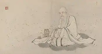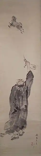 Zhang appears frequently in Chinese paintings and sculpture, either with the Eight Immortals or alone, and, like the other immortals, can be seen in many different common artistic mediums and everyday objects. He may be depicted standing or seated, but is typically shown riding his white mule, usually seated facing backwards. His emblem is a fish drum,[4] which is a tube-shaped bamboo drum with two iron rods or mallets that he carries with him,[5][6] or carrying a phoenix feather or a peach, representing immortality.[7] Since he represents old age, in the Taoist fengshui tradition, a picture or statue of him can be placed in the home or bedroom of an elderly person to help bring them a long life and a good, natural death.[8] A picture of him on his mule offering a descendant to a newly wed couple can also be found in Taoist nuptial chapels.[7]