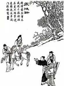 ![]() Zhang Hongjian encounters Shi and Shunhua while being escorted to the capital, in a 19th-century illustration from Xiangzhu liaozhai zhiyi tuyong (Liaozhai Zhiyi with commentary and illustrations; 1886) | |||